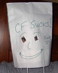 As you know, I’m not a CF-er and I don’t have a kid with CF, but I am ONE. BIG. FAN. I love your blog, I love your take on life and I love that you do it all while battling a crap disease the no one deserves – especially not anyone with as much to contribute to this fast-disintegrating world as you. So screw you CF. (There, I said it, what we’re all thinking but too polite to say.)