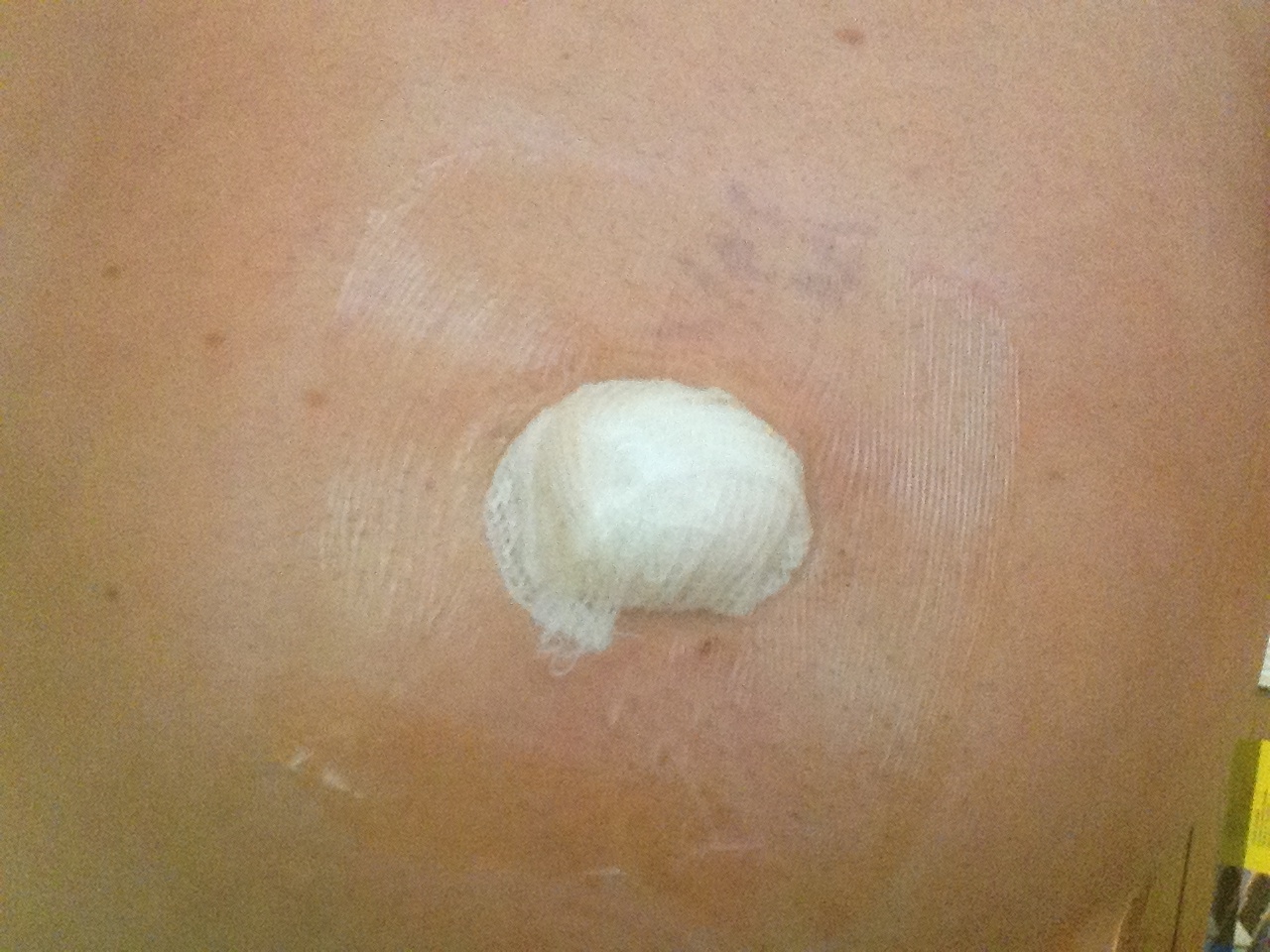 The least exciting picture I’ve ever placed on my blog. I call it, Cork in a blowhole. (I forget why the doctor in training wrote something on my stomach before the surgery. It’s not like I have a left and right belly button.)