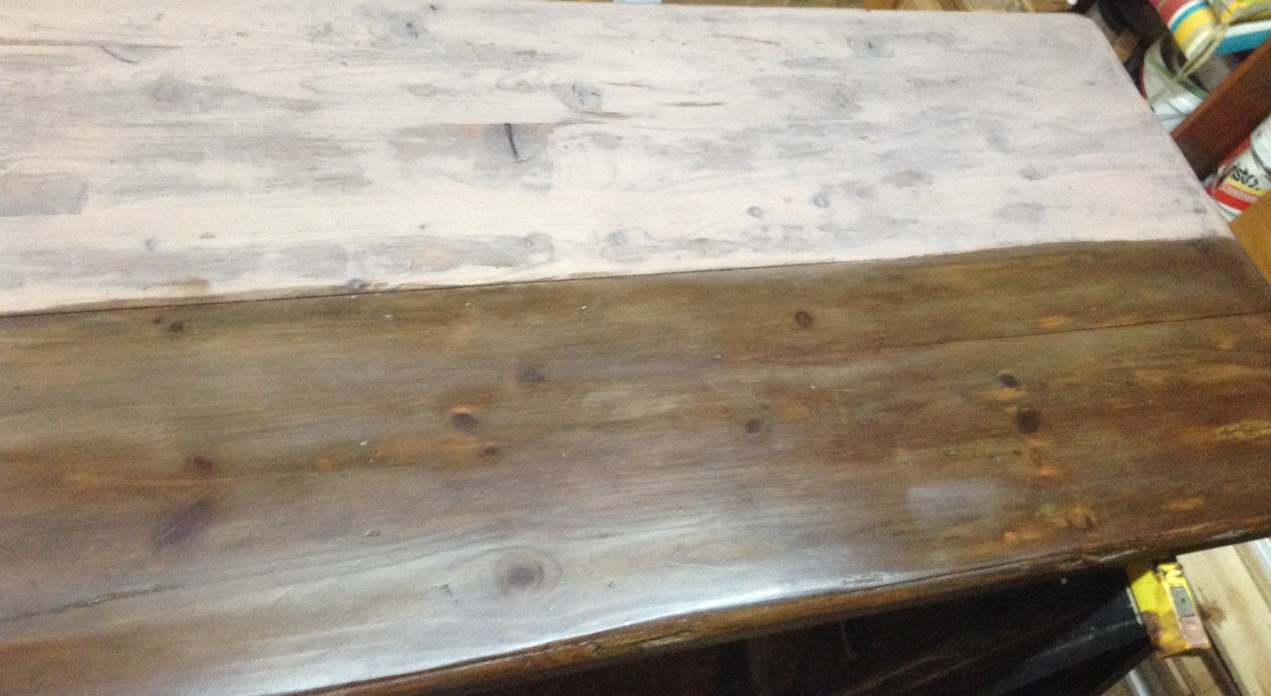 I used my apple-cider vinegar steel wool mix again. Half is finished and waxed here.