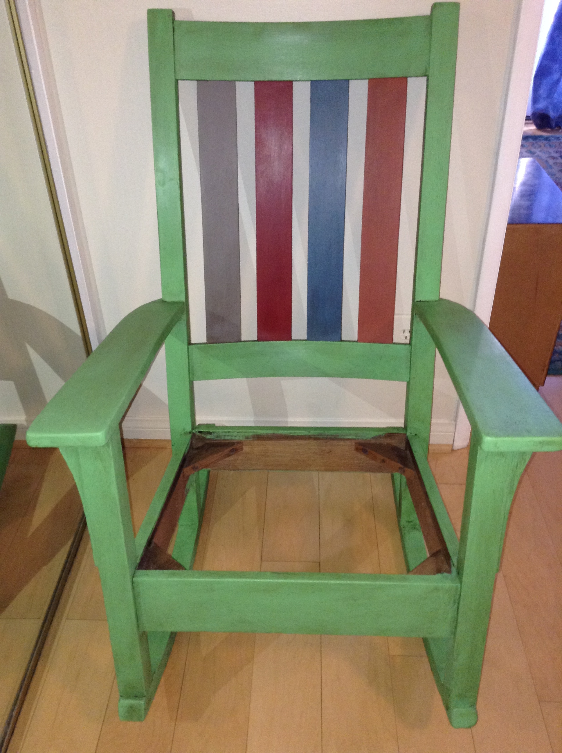 I found a rocking chair at a local consignment shop for 200 bucks. It’s solid tiger oak, which is one of my least favorite woods. So I did some light sanding of the peeling varnish and used Chalk Paint and dark wax to age and bring it back to life. I was going to sell it but I ended up giving it to my sister-in-law because she liked it and I think it’s cool that she’d put it in her house. Let’s keep it in the family.